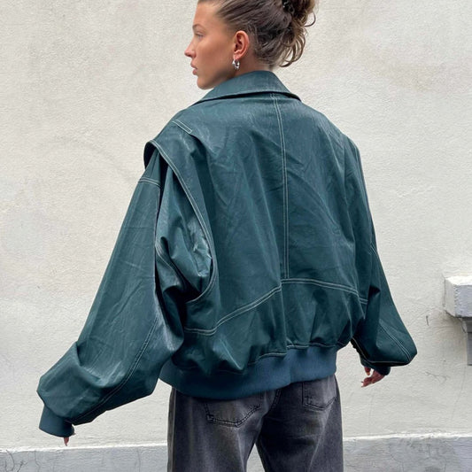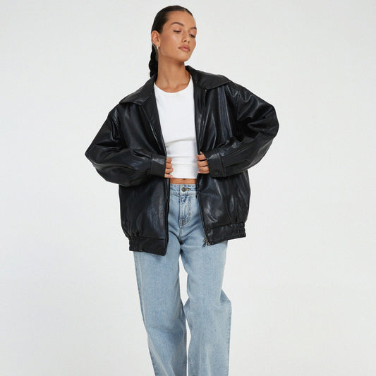 Damska kurtka oversize ze sztucznej skóry - Casualowa kurtka bomber z zamkiem błyskawicznym